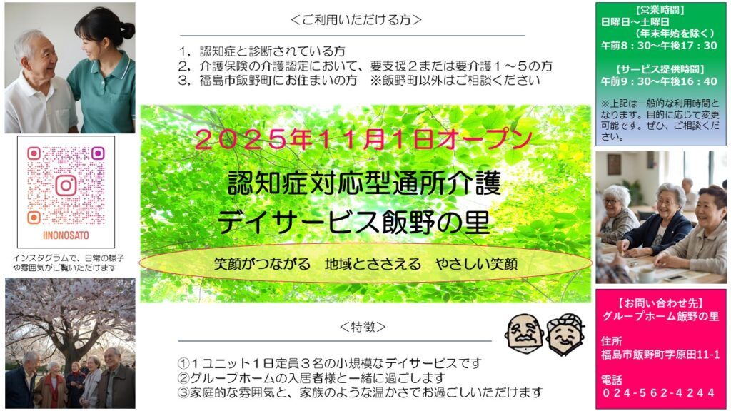 そんな願いから11月1日より、「認知症対応型通所介護 デイサービス飯野の里」を開所する運びとなりました。